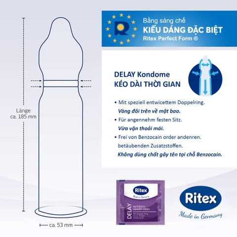 2. Bao KÉO DÀI THỜI GIAN – DELAY: Thiết kế với vòng đôi trên bao giúp thắt nhẹ vào vùng cổ dương vật, nam giới kiểm soát được cảm xúc giúp kéo dài cuộc yêu, chống xuất tinh sớm mà hoàn toàn không dùng chất gây tê tại chỗ Benzocain … (như những bao kéo dài thông thường khác). Đây cũng dòng bao tiên phong đột phá giúp kéo dài cuộc yêu một cách tự nhiên mà hoàn toàn không dùng chất gây tê tại chỗ.